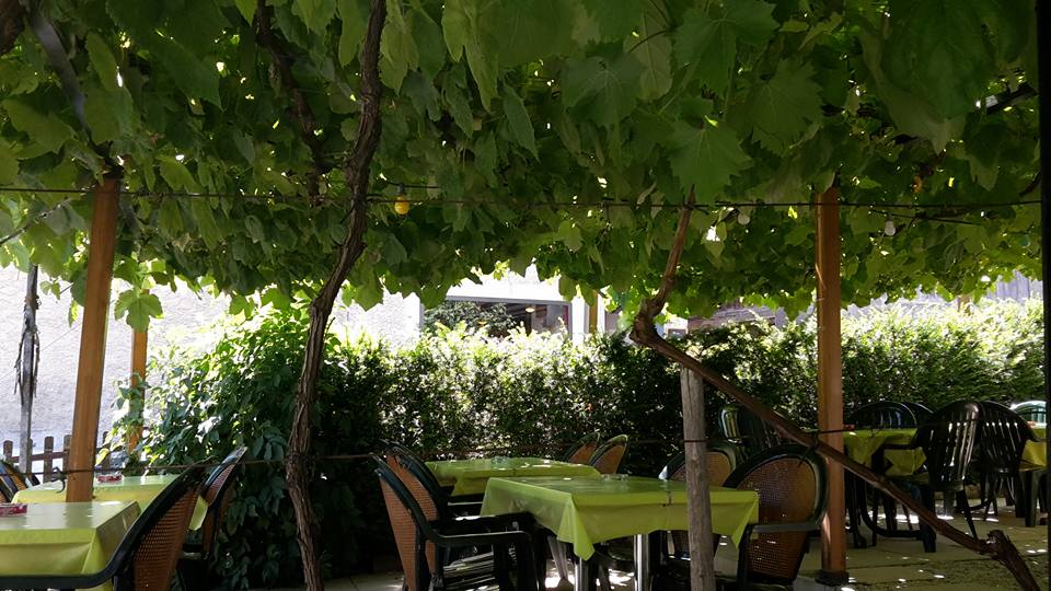 Unter einer mit Reben bedeckten Pergola, im Schatten des Glockenturms der Dorfkirche, erfrischt von dem in der Mitte thronenden Brunnen…..in aller Einfachheit.