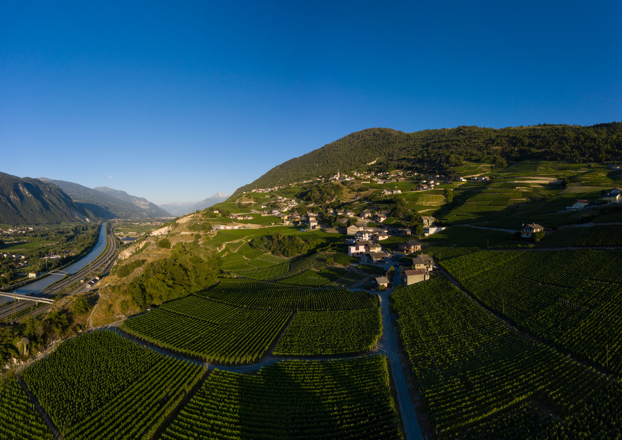 The vineyard, which faces due south on the first slopes of the right bank of the Rhône, consists mainly of terraced plots and stretches from St-Léonard to Sierre. No fewer than 13 grape varieties, including 6 indigenous ones, are grown on the 7.5 hectares farmed. The stony soils and dry stone walls combine to guarantee the production of quality grapes in an exceptional, warm environment.
